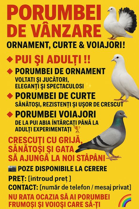 Intra pe OLX.ro si vezi toate anunturile din categoria de porumbei voiajori colorati in Arges ⭐ Cumpara porumbei voiajori colorati second hand sau noi!