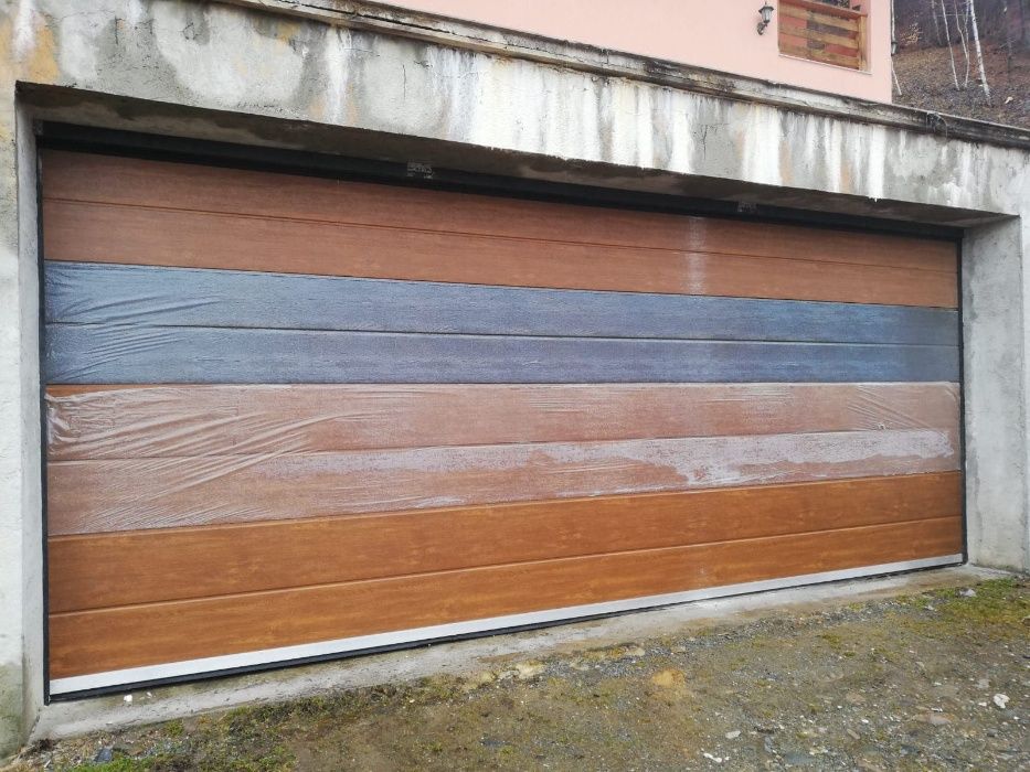 Usi de garaj stejar auriu cu un panou ral 9006