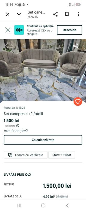 Găsește mobila perfectă pentru casa ta în categoria Mobila, unde poți descoperi o varietate de piese la prețuri avantajoase. De la canapele confortabile și fotolii elegante până la mese de dining și dulapuri spațioase, ai la dispoziție numeroase opțiuni pentru a-ți amenaja locuința după propriul gust. Fie că ești în căutarea unui colțar modern sau a unei comode vintage, vei găsi aici ceva care să se potrivească stilului tău. În această categorie, anunțurile sunt organizate astfel încât să îți fie cât mai ușor să găsești exact ceea ce cauți. Utilizează filtrele disponibile pentru a restrânge căutările și a descoperi piesele care îndeplinesc criteriile tale specifice. Poți alege între mobilă nouă sau utilizată, cu prețuri negociabile pentru multe dintre articole. De asemenea, există opțiuni diverse pentru toate bugetele și preferințele. Tranzacțiile sunt sigure și multe dintre produsele listate oferă opțiunea de livrare convenabilă, economisind astfel timp prețios. În plus, uneori poți găsi chiar paturi 160x200 gratuite disponibile în apropierea ta. Varietatea produselor din categoria Mobila este actualizată zilnic, asigurându-se că vei avea acces la cele mai recente oferte și modele. Dacă te interesează un anumit tip de mobilier, precum mobilier de bucătărie, vei putea filtra rezultatele pentru a găsi rapid ceea ce ai nevoie. Astfel, navigarea devine o experiență plăcută și eficientă. Pentru cei care doresc să facă o achiziție inteligentă fără stresul drumurilor inutile, livrarea este o opțiune excelentă disponibilă pe multe dintre anunțuri. Siguranța tranzacției este garantată prin intermediul platformei noastre de renume în domeniul mobilei. Ai parte de flexibilitate atât în termeni de prețuri cât și stiluri disponibile - tot ce trebuie să faci este să explorezi oferta variată pe care o avem pregătită special pentru tine!