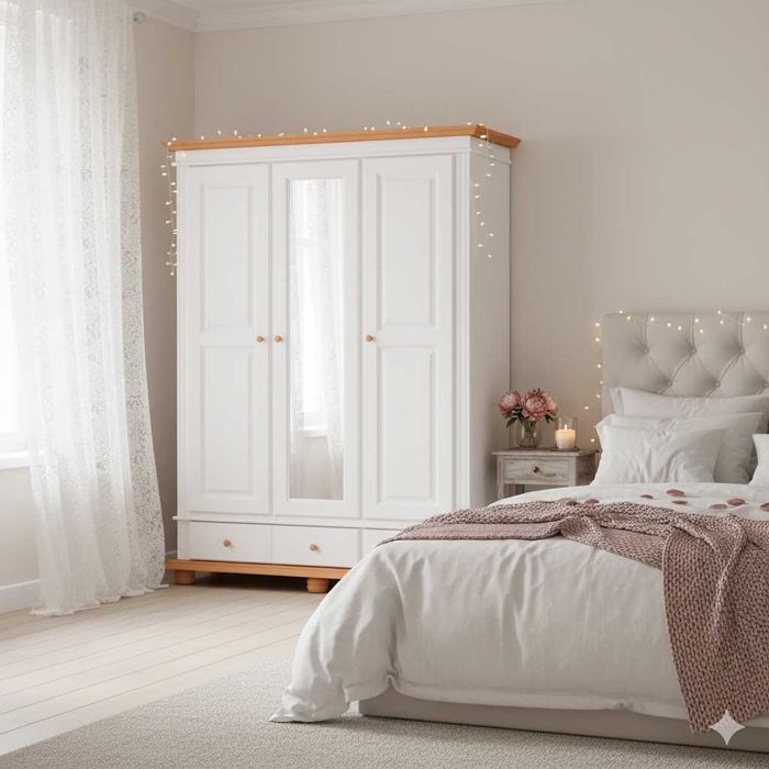 Dulap din lemn masiv cu oglinda Seby, 3 usi + 2 sertare, alb+miere