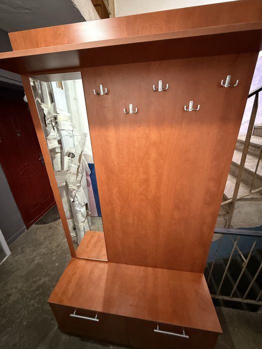 Cuier din lemn cu 2 rafturi de depozitare cu usa, oglinda si 5 cuiere
