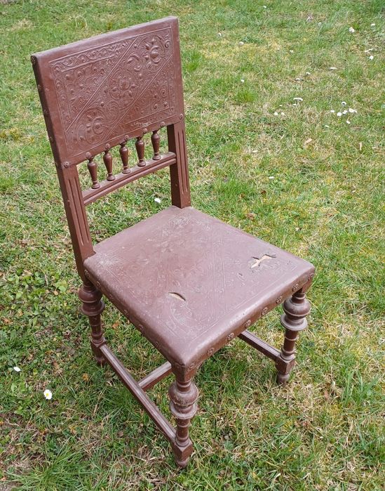 Scaun din lemn masiv cu piele sculptată – vintage/rustic