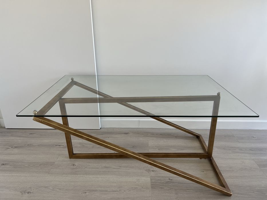 Măsuță de cafea – design asimetric, sticlă și cadru auriu