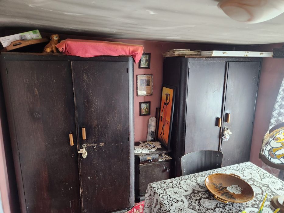 Vând mobila dormitor veche pentru recondiționat conține două dulapuri,pat,doua noptiere masa și două scaune