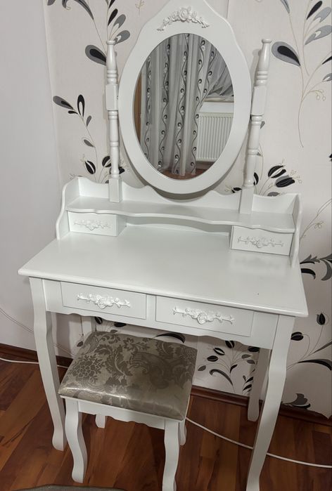 Masa de toaleta/Masuta de mireasa eleganta, alba cu oglinda si taburet