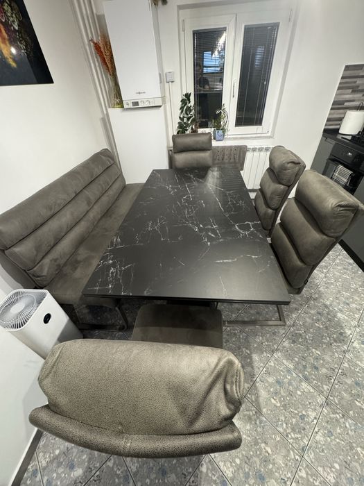 Masa de bucătărie extensibila cu scaune tapițate.