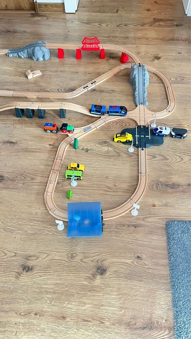 Jucarii din lemn: sine de tren + gara + accesorii