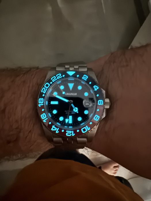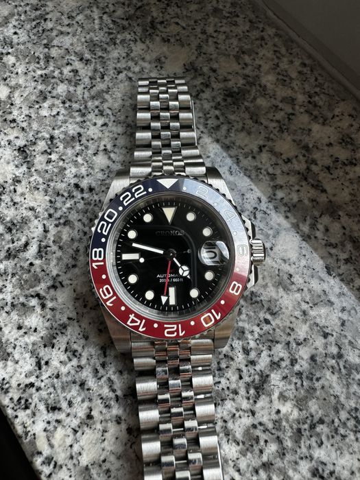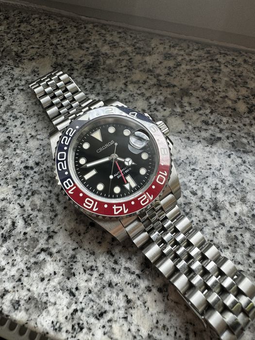 Vând ceas Cronos GMT Automatic, model “Pepsi”, cu un bezel ceramic iconic în culorile roșu și albastru, complet luminescent pentru vizibilitate excelentă pe timp de noapte. Ceasul este echipat cu un mecanism Seiko NH34, cunoscut pentru fiabilitatea sa, și dispune de o carcasă robustă din oțel inoxidabil 316L. Brățara jubilee este solidă și confortabilă