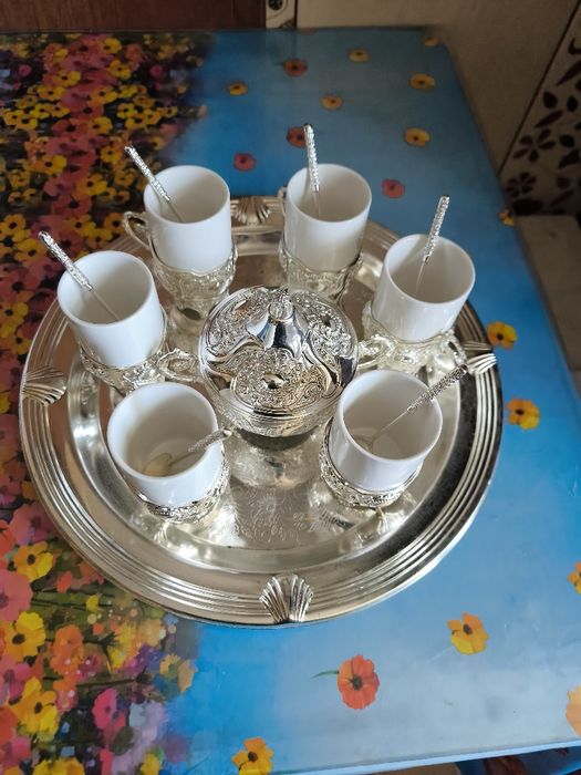 Set 6 Cani Din Portelan Cu Tava, Lingurite Si Zaharnita Argintata