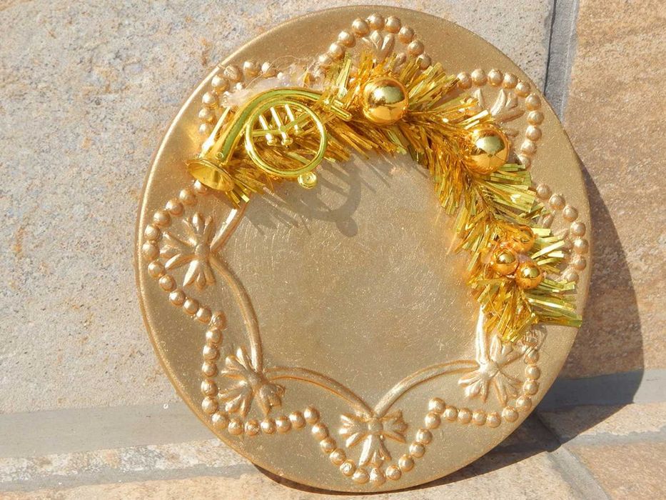 Farfurie decorativa beteala globuri mici si trompeta Craciun