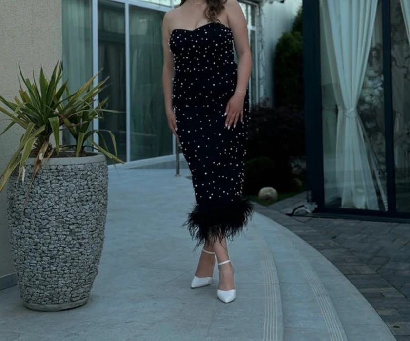 Rochie elegantă neagră cu perle și pene...