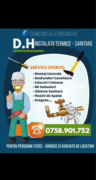 Boilere electrice Reparatii tevi Montaj obiecte sanitare Pompe de caldura Canalizari Centrale - boilere pe lemn Hidrofoare Incalzire in pardoseala Montaj - inlocuire baterii chiuveta Montaj aer conditionat Montaj calorifere Montaj centrale termice