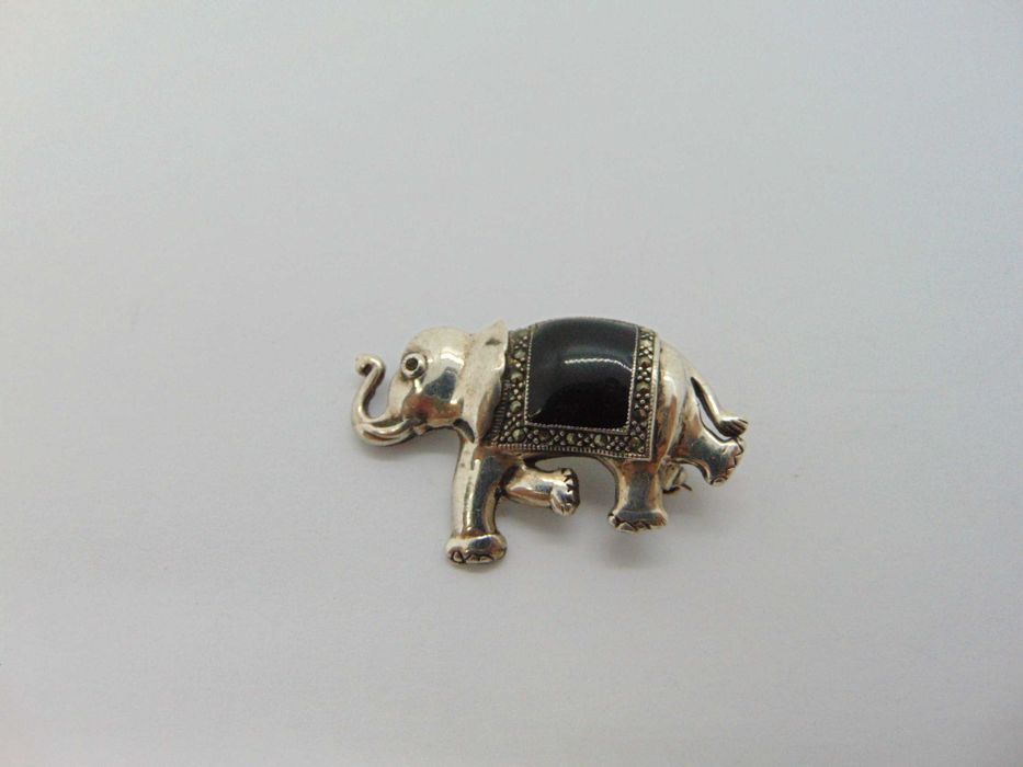 Brosa elefant din argint cu onix si marcasite