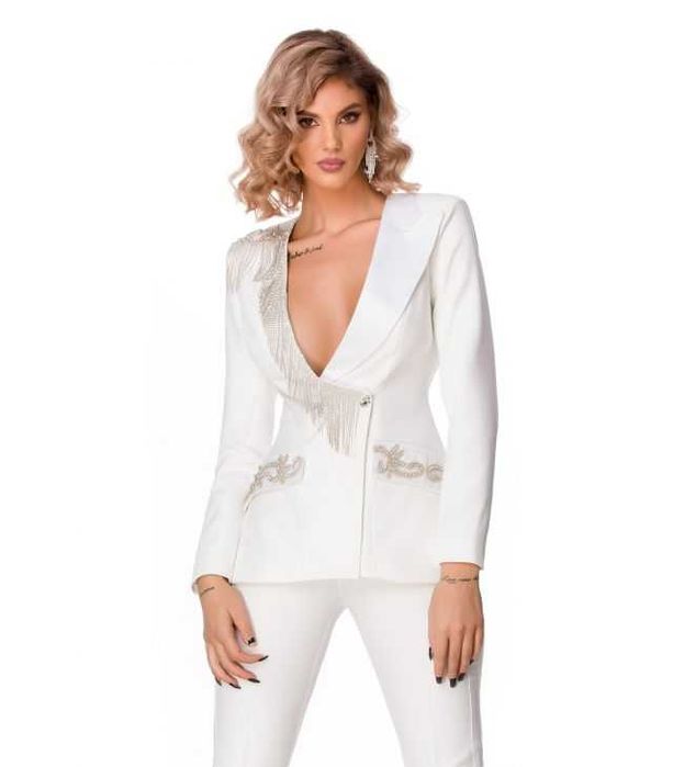 Costum alb de cununie/ botez BBY cu broderie strasuri epolet franjuri