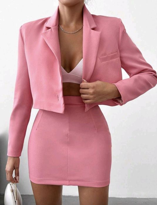 Costum roz (blazer cu un nasture + fustă)