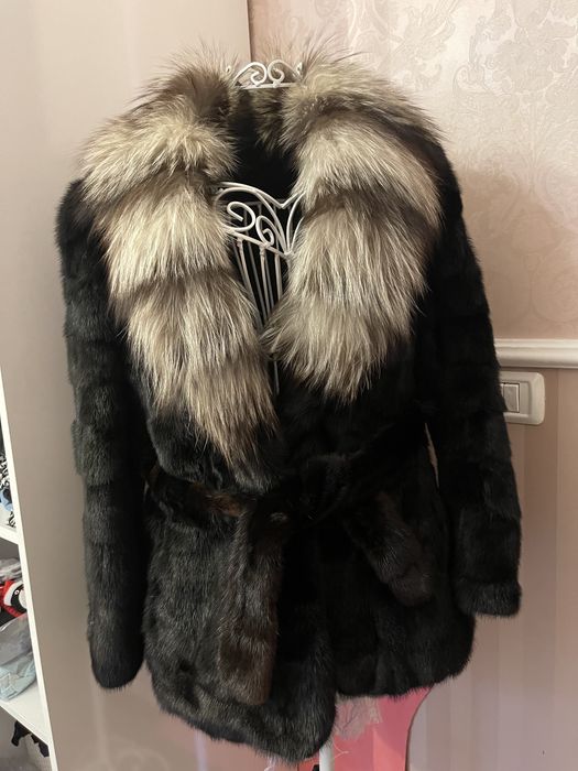 Haina din blana naturala de vizon/nurca, guler de vulpe argintie 42/44