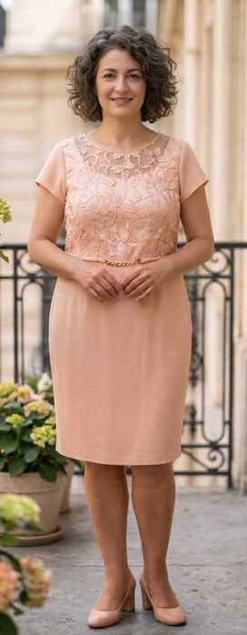 Rochie elegantă roz pudră cu dantelă și detaliu auriu, mărimea 48
