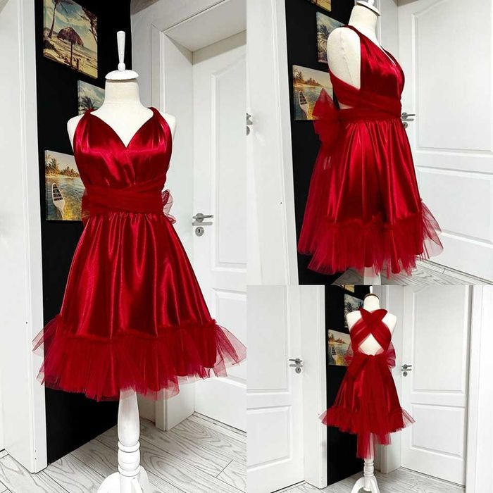 Rochie versatila scurta din satin cu bretele si bordura de tulle  M