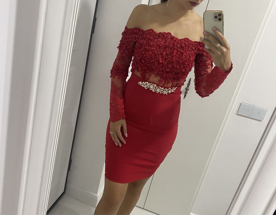 Rochie de ocazie roșie, pe umeri, cu accesoriu in talie