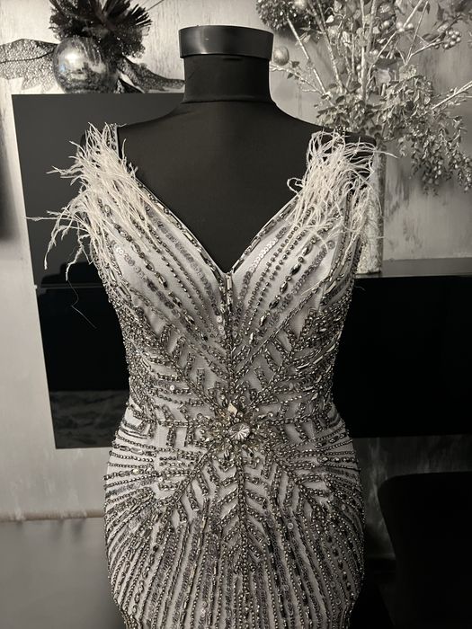 Rochie argintie cu perle lunga Andreea Veneciuc