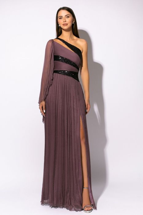 Rochie elegantă de seară cu paiete și accente de blană