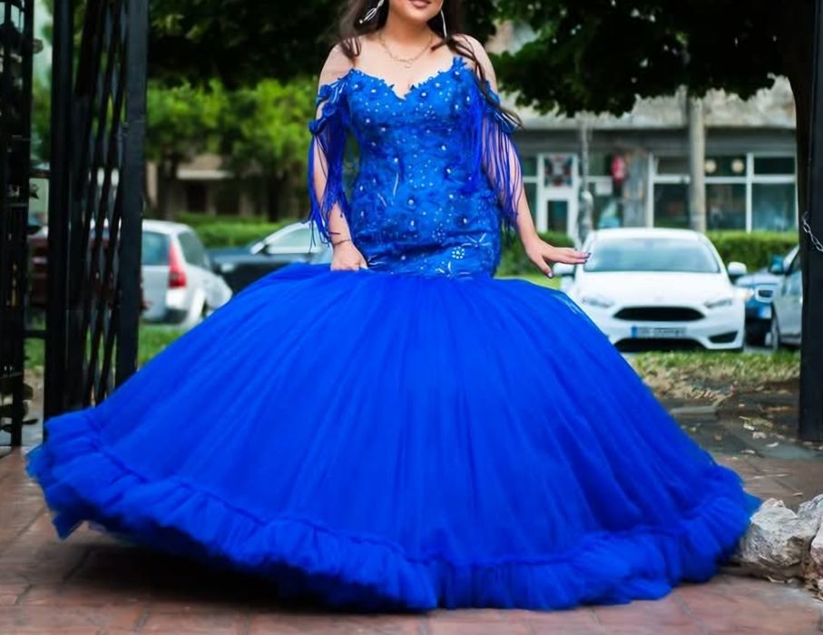 Rochie albastra ocazie, nunta, botez cu trena