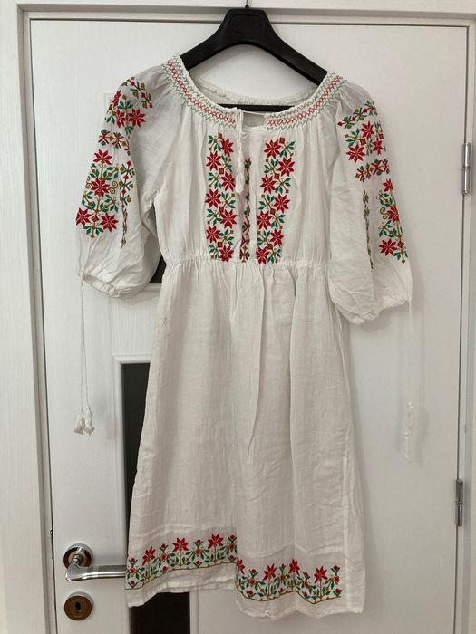 Rochie alba din in cu model tradițional