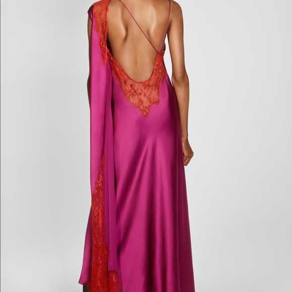 Zara rochie lunga fuchsia roz satin dantela spate gol