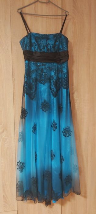 Rochita lunga de gala, deosebita, albastru lucios cu dantela neagra