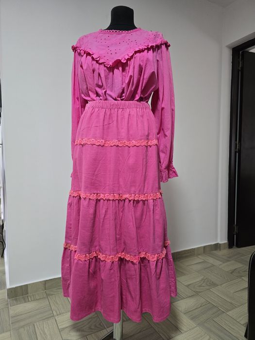 Fusta fucsia din bumbac premium, model cu volane si dantela finuta