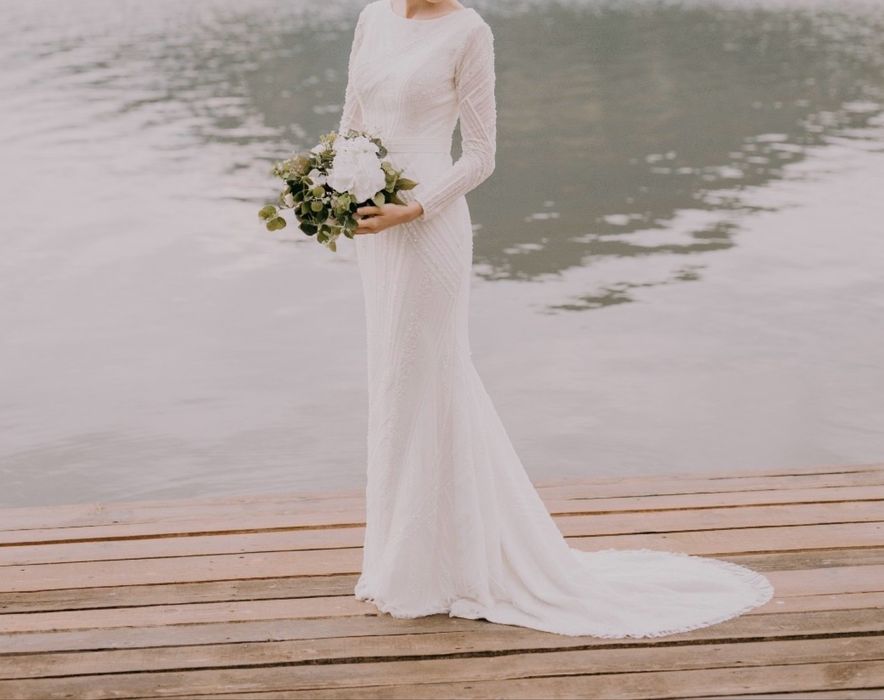 Rochie mireasa decenta cu maneci, trena, tip Sirena, XS -S, margele