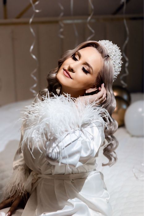 Rochie alba geanta halat accesoriu păr mireasă