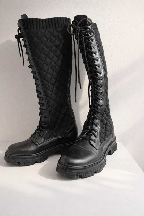 Cizme înalte până la genunchi – negre – quilted – talpă chunky