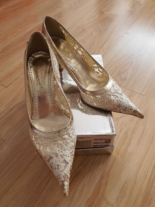 Pantofi de dantela alba cu auriu marimea 39 toc 7cm
