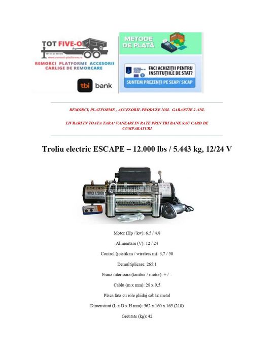 Troliu Electric Escape, 12000 Lbs Pentru Remorci si platforme