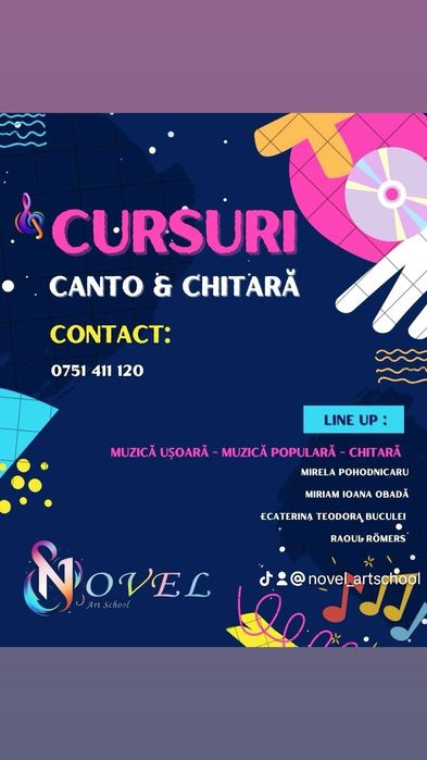 In ceea ce priveste oferta de cursuri de muzica, pe olx.ro iti oferim o varietate impresionanta: cursuri de chitara, cursuri de canto, de clarinet, pian, saxofon, percutie, vioara etc., practice, dar si teoretice. De asemenea, ai ocazia sa incepi cursuri de arta – de exemplu, de pictura, sculptura, desen/grafica si design vestimentar. Pentru o pregatire solida, alege meditatii pentru admitere la liceul de arte plastice. In aria sporturilor, se ofera in principal cursuri de dans pentru incepatori si avansati.