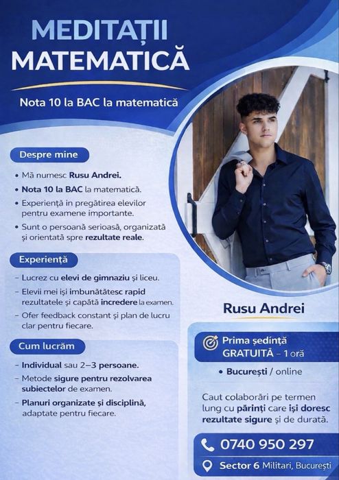 Descopera pe OLX o gama variata de anunturi de meditatii matematica sector 6 ➤ Preturi avantajoase ➤ Anunturi actualizate zilnic
