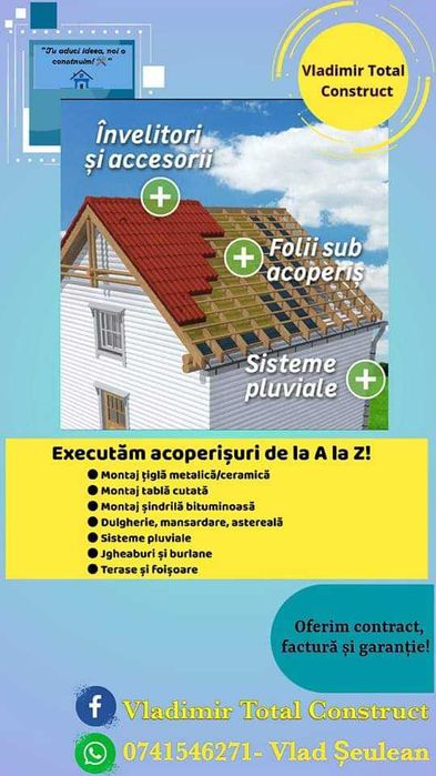 Constructie acoperis nou Curatare acoperis Sisteme pluviale - jgheaburi - burlane Vopsire acoperis tabla Dulgherie Inlocuire acoperis existent Izolatii acoperis Mansardari Montaj si reparatii sisteme parazapezi Reconditionari acoperis monumente istorice Reparatii acoperisuri Sarpante