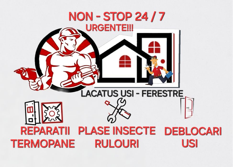 Deblocari usi Montaj pervazuri Montaj si reparatii usi exterioare Montaj si reparatii usi interioare Montaj termopane Plase insecte Reglaje - inlocuire feronerie Reparatii termopane Rulouri - jaluzele exterioare Rulouri - jaluzele interioare