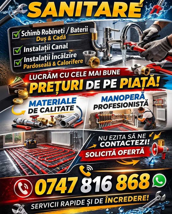 Boilere electrice Canalizari Centrale - boilere pe lemn Hidrofoare Incalzire in pardoseala Montaj - inlocuire baterii chiuveta Montaj calorifere Montaj centrale termice Montaj obiecte sanitare Reductoare apa