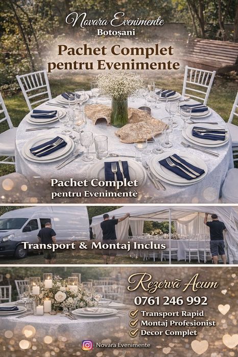 Pe olx.ro poti gasi oferte diverse pentru servicii evenimente. In functie de evenimentul pe care il ai, alege din anunturi variate, sau poti inclusiv sa gasesti inspiratie pentru evenimentul tau. Pe olx.ro gasesti servicii evenimente de foto-video, formatii artistice, aranajmente sau decoratiuni, catering si multe altele. Daca esti in cautare de altceva, cauta in subcategoria alte servicii pentru evenimente. Poti gasi anunturi pentru fum greu, oglinda magica, platforme 360 si multe alte servicii evenimente. Rasfoieste anunturile si gaseste ceva potrivit pentru evenimentul tau.