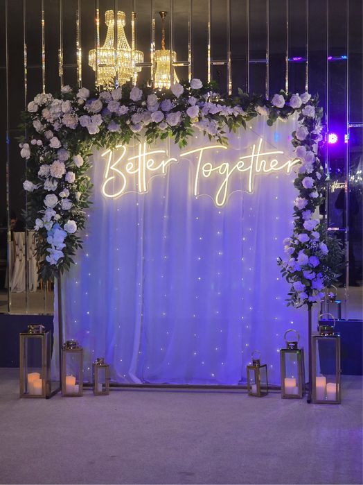 Decoruri nuntă (arcade, stalpisori, litere volumetrice/luminoase)