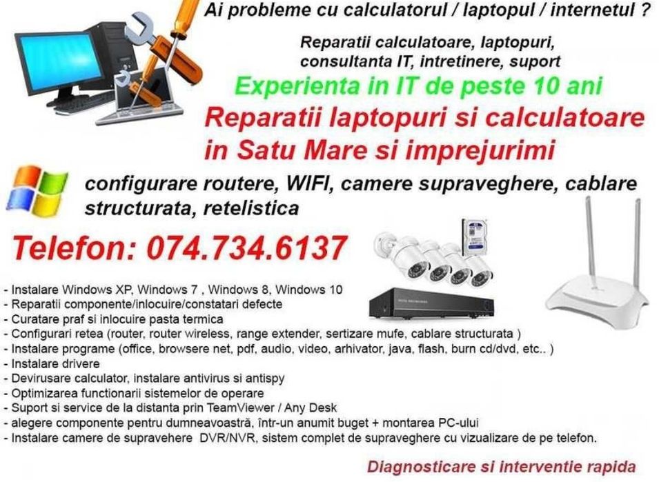 Acceseaza acum cele mai “proaspete” anunturi din domeniul IT hardware si software, de la specialisti gata sa-ti vina in ajutor oricand. Prin noi gasesti servicii complete din aria reparatii PC si laptop, instalare Windows sau alte sisteme de operare, asamblari calculatoare, curatare, montare piese noi si configurari. Nu este necesar sa ai cunostinte in acest domeniu – chiar daca nu stii de ce nu mai functioneaza calculatorul, laptopul sau tableta ta, tehnicienii se vor ocupa inclusiv de diagnosticare.