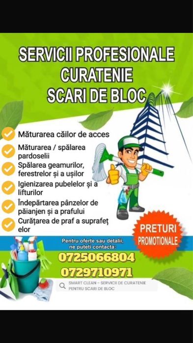 Serviciile de curatenie sunt, in general, extrem de populare in cautarile clientilor, pentru usurinta gasirii profesionistilor si a comunicarii. In categoria de fata intra servicii precum transport moloz si deseuri, vidanjare fose septice, curatare canapele si alte tipuri de mobilier, curatenie industriala, curatenie spatii comerciale, curatare teren si defrisari, curatare hornuri case, sobe si centrale si multe altele. Practic, de la curatare pasuni la sisteme PC, toate sunt disponibile in aceasta categorie. Cel mai adesea, clientii cauta servicii de debarasare si transport deseuri, dar si de curatenie pentru scari de bloc si alte spatii.