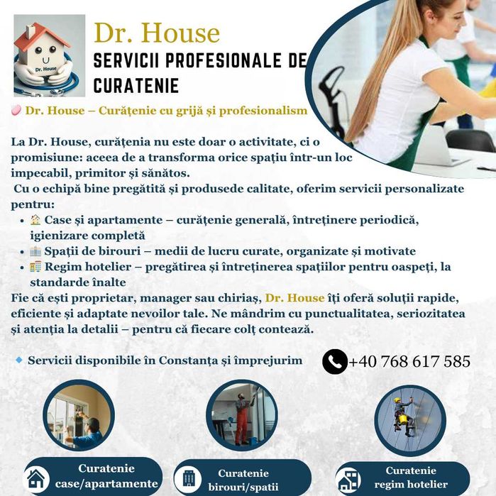 In anuntul pentru un serviciu de curatenie pe OLX.ro, poti raspandi un strop de magie prin includerea informatiilor esentiale si atragatoare. Fii precis si detaliat, mentioneaza tipul de curatenie oferita (generala, dupa evenimente etc.), suprafata pe care se va actiona, frecventa serviciului si orice caracteristici speciale. Insoteste anuntul cu fotografii captivante pentru a ilustra profesionalismul si calitatea serviciului tau, precum curatenie la domiciliu. Foloseste cuvinte potrivite pentru a transmite experienta unica pe care o oferi prin firma de curatenie. Cu OLX.ro, anuntul tau va straluci si vei atrage cu siguranta privirile clientilor interesati de curatenie impecabila si servicii de vis!