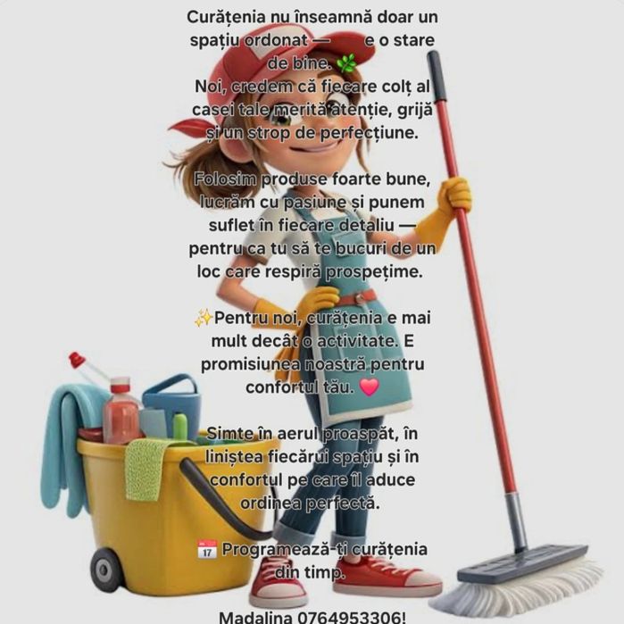 Caut doamnă pentru curățenie – colaborare stabilă