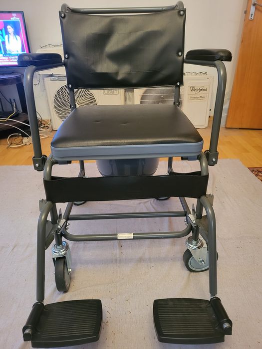 Scaun tip wc cu otita detașabilă, roti și suport pentru picioare.