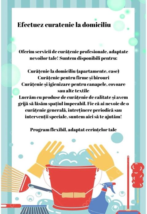 In anuntul pentru un serviciu de curatenie pe OLX.ro, poti raspandi un strop de magie prin includerea informatiilor esentiale si atragatoare. Fii precis si detaliat, mentioneaza tipul de curatenie oferita (generala, dupa evenimente etc.), suprafata pe care se va actiona, frecventa serviciului si orice caracteristici speciale. Insoteste anuntul cu fotografii captivante pentru a ilustra profesionalismul si calitatea serviciului tau, precum curatenie la domiciliu. Foloseste cuvinte potrivite pentru a transmite experienta unica pe care o oferi prin firma de curatenie. Cu OLX.ro, anuntul tau va straluci si vei atrage cu siguranta privirile clientilor interesati de curatenie impecabila si servicii de vis!