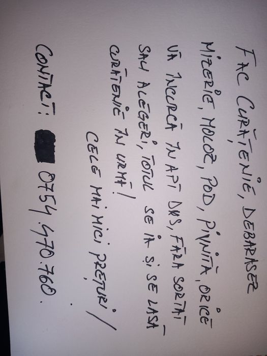 OLX.ro iti deschide usile catre o lume plina de avantaje in contactarea serviciilor de curatenie! Cu un strop de farmec, gasesti furnizori priceputi si pasionati sau firme de curatenie. Cu un simplu click, ai acces la o varietate de oferte atractive si promotii speciale. OLX.ro promoveaza comunicarea directa cu furnizorii de curatenie la domiciliu, astfel incat sa poti discuta detaliile si sa alegi solutia perfecta. Cu flexibilitate in programare si tarife accesibile, OLX.ro iti ofera experienta curateniei fara batai de cap. Alege OLX.ro pentru a aduce magia curateniei in casa ta si bucura-te de o viata mai stralucitoare si mai confortabila!