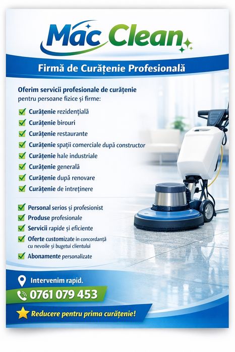 Cu un strop de curiozitate, exploreaza sectiunea dedicata serviciilor de curatenie si aplica filtrele dorite, precum firme de curatenie. Descopera o varietate de oferte atragatoare, de la curatenie la domiciliu pana la curatenie dupa evenimente. Comunica direct cu furnizorii pentru a discuta nevoile tale si a alege serviciile personalizate. OLX.ro iti aduce serviciile pentru firma de curatenie la usa casei tale, astfel incat sa te bucuri de un mediu curat si primitor, fara efort. Alege OLX.ro pentru a-ti gasi magia curateniei in cel mai simplu mod!